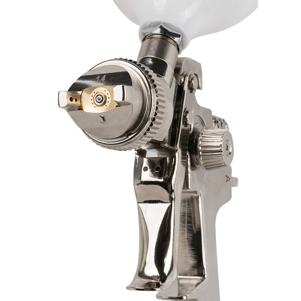 Projetada para profissionais, esta pistola pneumática oferece pulverização precisa e uniforme graças ao seu sistema de alimentação por gravidade. Com bicos de Ø1,4 e Ø1,8 mm, permite ajustar o fluxo de tinta entre 100 e 190 mL/min e uma largura de pulverização de 160-240 mm, ideal para acabamentos detalhados e superfícies amplas.