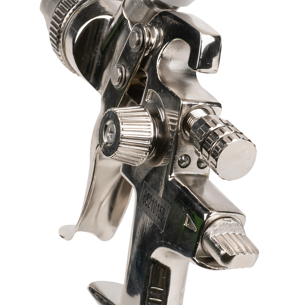 Opera com uma pressão de trabalho de 0,3 MPa e um fluxo de ar de 6-10 scfm, garantindo atomização fina e eficiente. Seu reservatório de 600 ml proporciona maior autonomia para trabalhos contínuos.